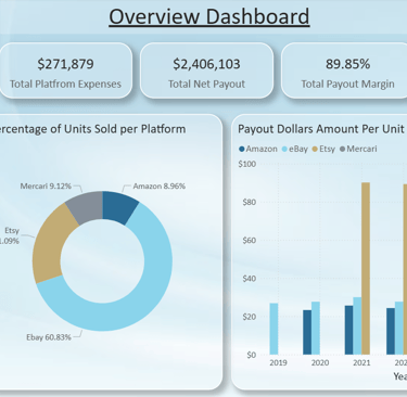 This gives decision-makers a fast, top-level read on performance. From there, visuals help compare marketplaces side-by-side. One example is a donut chart showing platform share by units sold. More insightful still is the payout-per-unit metric, which highlights where each sale is most profitable — a key comparison many sellers overlook.