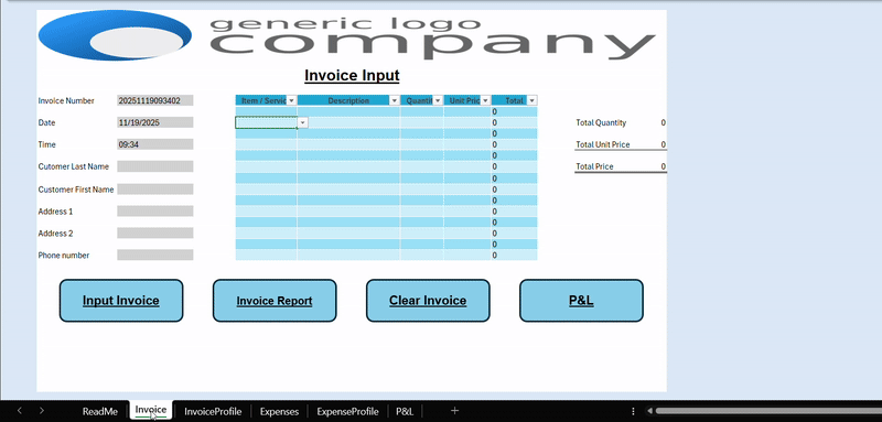 Each invoice receives a unique identifier based on the exact date and time—down to the second—combined with the customer’s initials. The form captures all key details and stores them directly in Excel, ensuring your data is consistent and reusable.