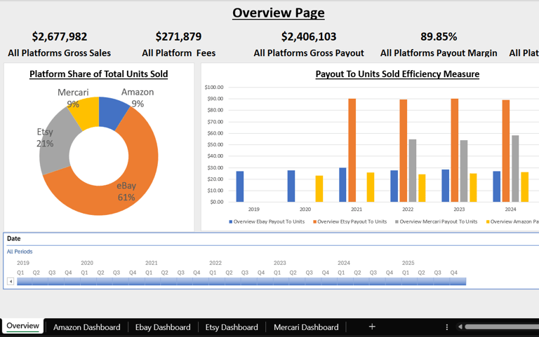 The Overview page displays a unified view of all connected platforms, showing their contribution by units sold, key efficiency metrics, and essential KPIs. A date timeline lets you isolate specific periods, and every chart and KPI responds instantly. Navigation buttons along the side allow quick movement between sections to explore each platform in detail.